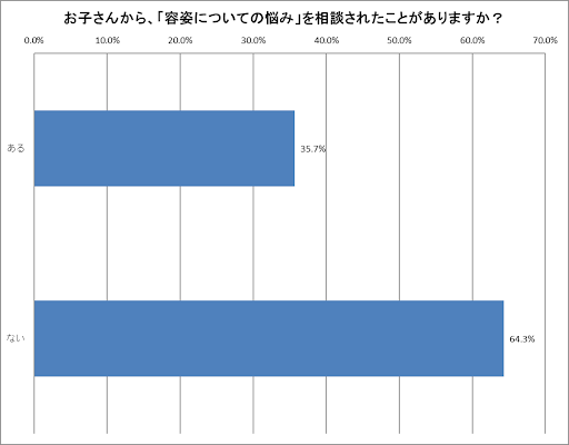 自分の見た目に悩む子供は多くいます。当院が実施した保護者を対象とするWeb調査では、「あなたはお子さんから、容姿についての悩みを相談されたことがありますか?」という問いに対して、35.7%の保護者が「ある」と回答しています。 つまり、3分の1以上の親が子供から容姿に関する相談を受けているのです。