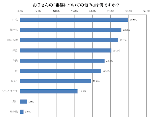 実際には容姿についての悩みを親に打ち明けられない子供もいると考えると、さらに多くの子供が容姿について悩んでいることでしょう。 また、子供が持つ容姿への悩みの内容をみると、抱える悩みやコンプレックスは多岐にわたることがわかります。