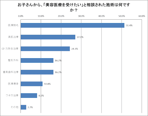 実際、子供から「美容医療を受けたい」と相談されたときの希望の施術内容をみると、2人に1人以上が「医療脱毛」を求めていることが分かりました。
