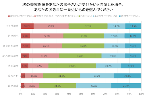 さらに、子供の医療脱毛やワキガ治療、美肌治療、審美歯科治療については多くの保護者が理解を示しており、体毛や肌に関する悩みとその治療には抵抗がない保護者が多いようです。